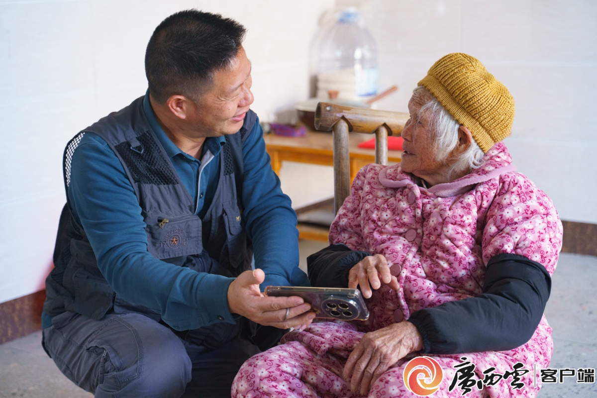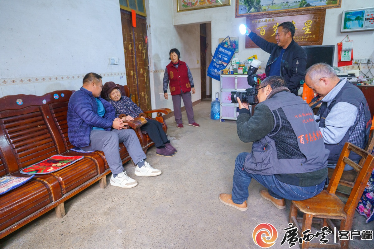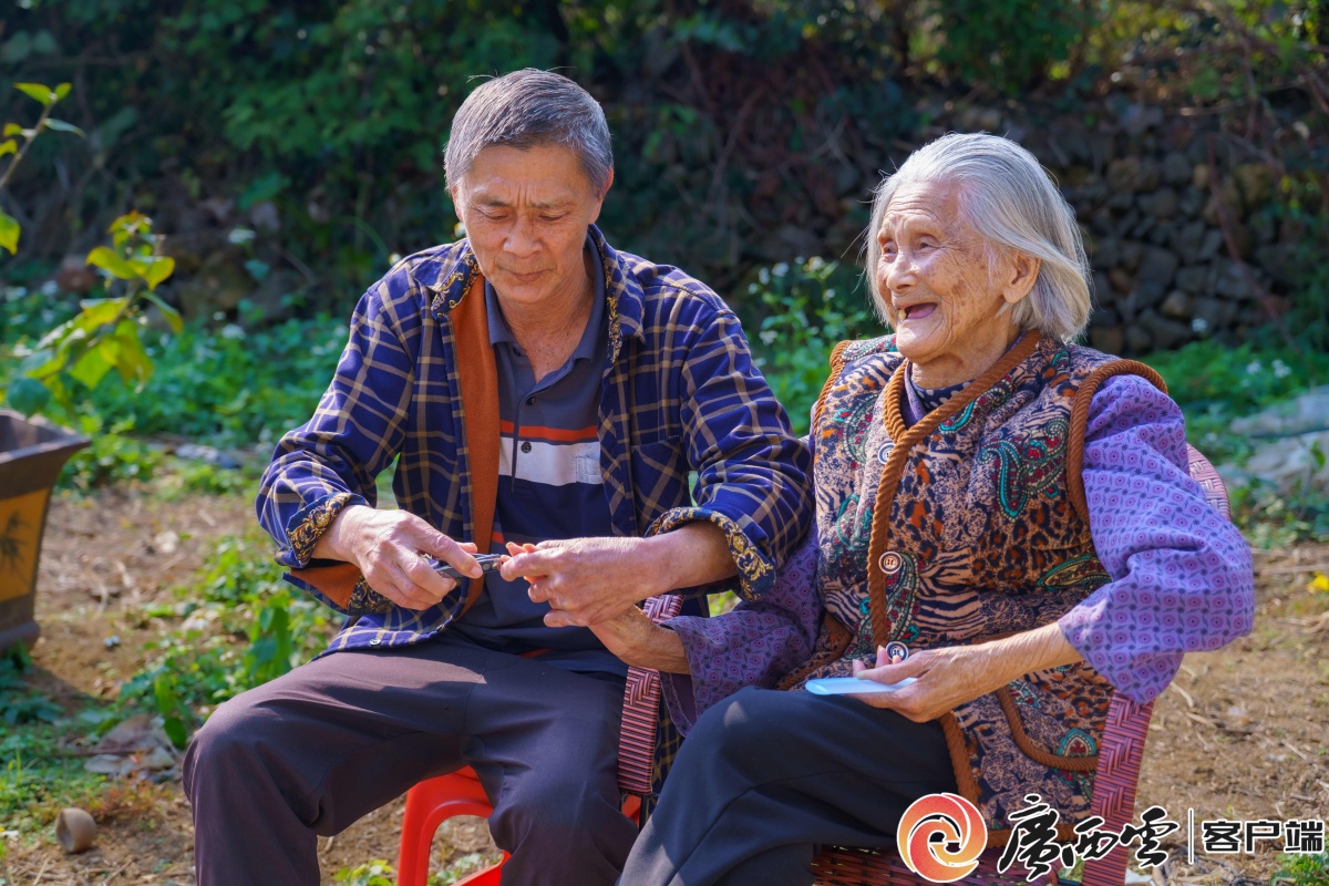 黃金鎮(zhèn)義和村104歲老人何世鸞的兒子正在為她剪指甲。 近日,河池市“百歲壽星影像志”文藝志愿者拍攝分隊(duì)走進(jìn)羅城仫佬族自治縣黃金鎮(zhèn),用鏡頭記錄下當(dāng)?shù)厝话贇q老人及一位98歲高齡老人的日常生活場(chǎng)景。 廣西攝影家協(xié)會(huì)副主席楊景洪與3名河池市航拍協(xié)會(huì)成員在融洽的氛圍中,用相機(jī)捕捉老人的日常起居、家庭互動(dòng)與生活細(xì)節(jié)。鏡頭里,四位老人神態(tài)安然、精神矍鑠,展現(xiàn)出從容豁達(dá)的生活狀態(tài)。