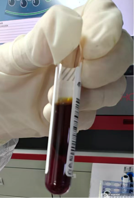患者出現(xiàn)血管內溶血情況。岑威 攝 前沿技術:兩次半全血置換術扭轉乾坤 11月11日凌晨,在莫柱寧的指導下,輸血科副主任醫(yī)師岑威聯(lián)合重癥醫(yī)學科團隊給患者實施了第一次半全血置換,換掉了她體內約80%的“問題血液”,同時輸入了8個單位的健康紅細胞、1640毫升血漿和1份血小板。 術后監(jiān)測發(fā)現(xiàn),患者體內的乳酸(反映缺氧水平)下降了一半,凝血指標也從嚴重超標降到接近正常,膽紅素也少了30%,治療初見成效。然而,患者的腎臟功能還在持續(xù)惡化,血液里的毒素指標仍在持續(xù)上升,同時也無法正常排尿。當天下午,醫(yī)生果斷進行了第二次半全血置換手術,并聯(lián)合實施連續(xù)性腎臟替代治療,即通過機器代替腎臟排毒。 兩次治療后,好消息接連傳來:患者的膽紅素降到了安全范圍,凝血功能也恢復正常,神志逐漸轉清醒,心率、血壓等生命體征也穩(wěn)定了。 整個搶救過程還得益于南寧中心血站的大力幫助,及時、足量保障急救用血的供應,讓救治工作得以順利進行。 全程守護:多學科接力促全面康復 11月13日,脫離生命危險后的張女士被轉到自治區(qū)人民醫(yī)院腎內科接受后續(xù)治療。經(jīng)過精準控制體內液體量、血液凈化和營養(yǎng)支持等一系列專業(yè)治療和護理,她的各項并發(fā)癥慢慢得到了控制,身體也逐漸恢復。12月2日,張女士順利出院,返回當?shù)乩^續(xù)接受康復治療。 據(jù)介紹,這是自治區(qū)人民醫(yī)院用半全血置換技術成功救活的又一危重蜂蜇傷患者,救治中采用的“半全血置換+腎臟替代治療+器官功能維護”組合救治策略,為治療蜂毒引發(fā)的多器官衰竭積累了寶貴經(jīng)驗。 近年來,該院輸血科在廣西開展了包括富血小板血漿(PRP)治療、淋巴血漿置換、半全血置換、全血置換等多項前沿輸血治療技術,目前已形成“精準評估—個體化置換—多學科護航”的全鏈條救治模式。 |