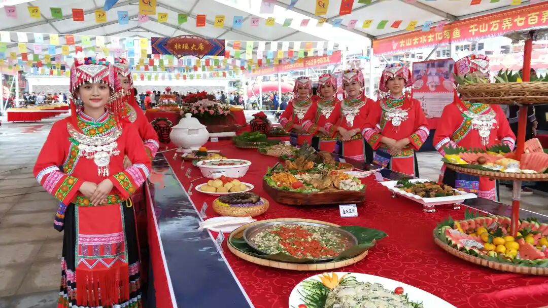 瑤家簸箕宴。覃文軍 攝 在“瑤鄉(xiāng)文旅推介會”“布努瑤祝著節(jié)”等活動中,大化同步設(shè)置農(nóng)產(chǎn)品展銷區(qū)與直播帶貨環(huán)節(jié),讓瑤鄉(xiāng)風(fēng)物成為“可帶走的旅游記憶”。2025年“瑤鄉(xiāng)豐收節(jié)”專場活動中,七百弄雞、旱藕粉等即時成交額達(dá)2.8萬元,現(xiàn)場簽約文旅綜合體開發(fā)、農(nóng)旅線路合作及農(nóng)產(chǎn)品采購意向訂單4000萬元,實現(xiàn)“文旅+消費”雙豐收。