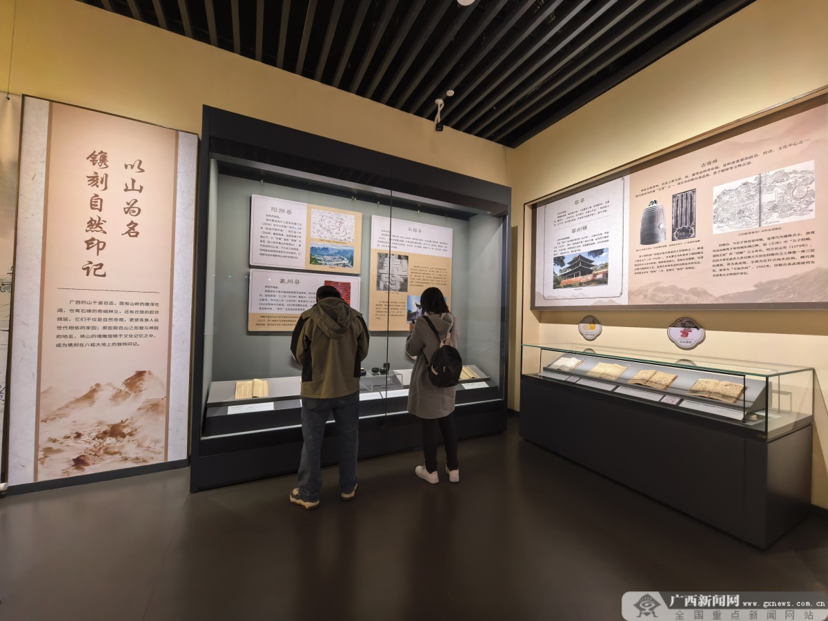 展覽現(xiàn)場(chǎng)。 為保護(hù)傳承地名文化,賡續(xù)行政區(qū)劃歷史文脈,2022至2024年,自治區(qū)民政廳聯(lián)合自治區(qū)住房和城鄉(xiāng)建設(shè)廳、自治區(qū)文化和旅游廳、自治區(qū)地方志編纂委員會(huì)辦公室組織開(kāi)展了3批次廣西地名文化遺產(chǎn)認(rèn)定工作,階段性認(rèn)定32個(gè)千年古縣、13個(gè)千年古鎮(zhèn)、11個(gè)千年古村落。本次展覽以“望山 見(jiàn)水 記鄉(xiāng)愁”為主題,通過(guò)以山為名、以水為名、以形勝為名、以歷史文化為名、以美好愿景為名5個(gè)單元,普及這56個(gè)地名的來(lái)源,呈現(xiàn)其背后的政治、經(jīng)濟(jì)、文化等方面的縮影及其歷史內(nèi)涵,展現(xiàn)八桂厚重的地名文化。