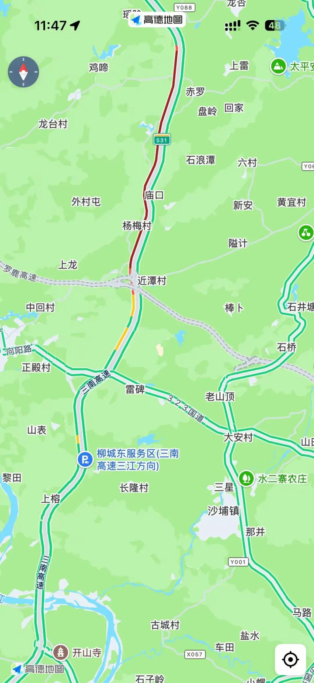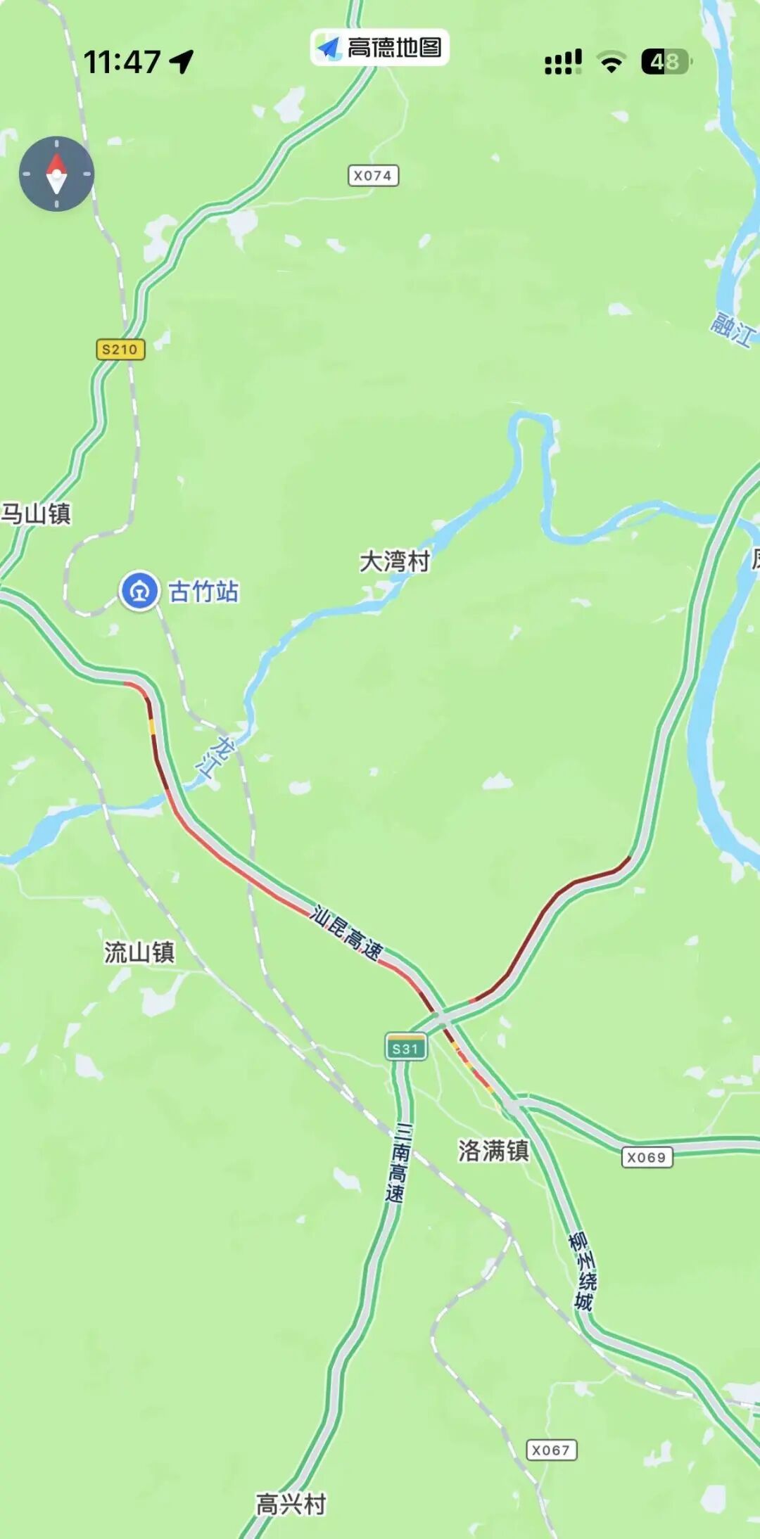 2月23日11點47 從高德地圖上看 三南高速、汕昆高速往柳州方向 有多路段顯示紅色