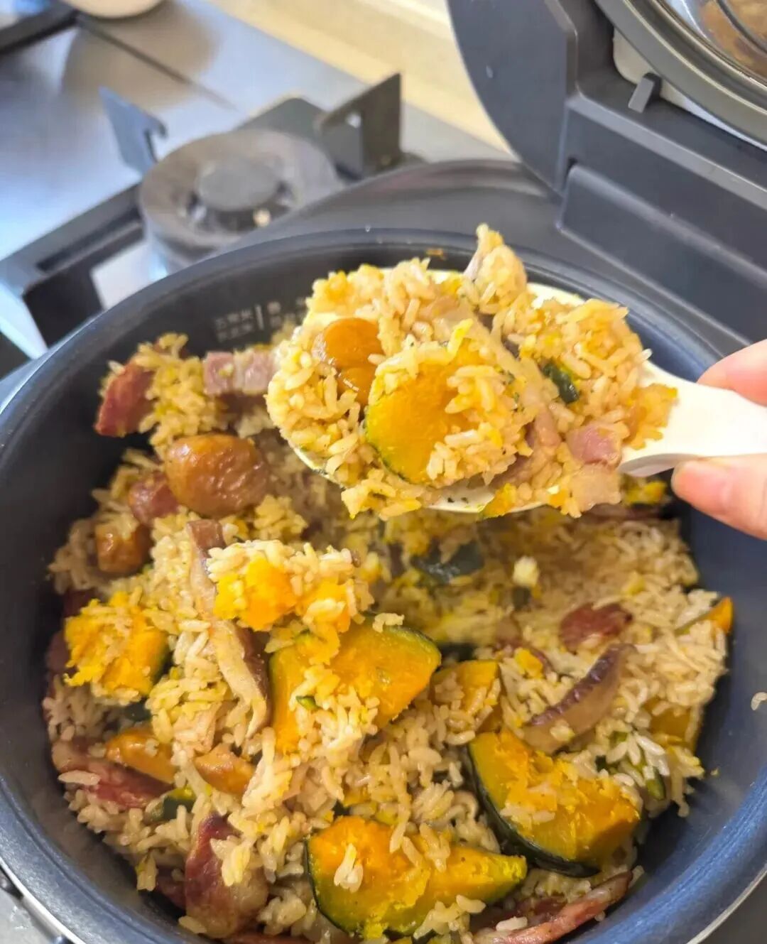這不是一時興起 而是他們連續(xù)第三年帶飯上路 出發(fā)前燜好的 南瓜板栗香腸燜飯 金黃軟糯、臘香四溢 保溫四五個小時依舊溫?zé)?/p>