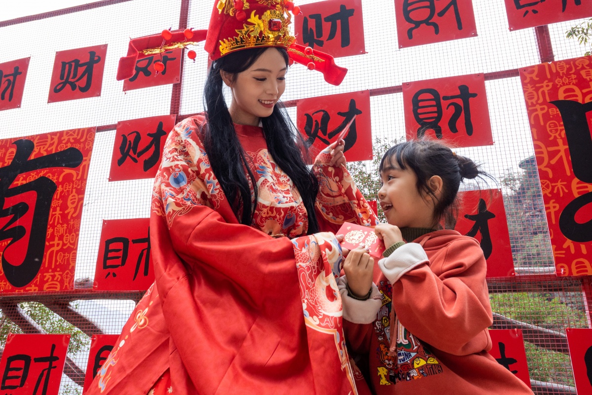 “財神”在金秀瑤族自治縣大瑤山盤王界景區(qū)給游客派發(fā)禮物。